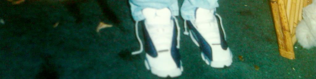 (OG Flint 13's) These had to be my favorite pair at the time because of the colorway. Grey and Blue are 2 of my favorite colors. LOL, i had two pairs of these i think because this pair in the picture were a half size small but my father always made sure i HAD them before they came out, so a half size before release then my true size after release if not the day of. How "ballin" is that? did you do that? lol..